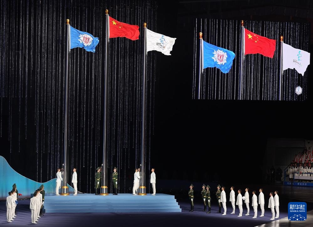 ??2月17日,中華人民共和國國旗在開幕式上升起。新華社記者 黃偉 攝