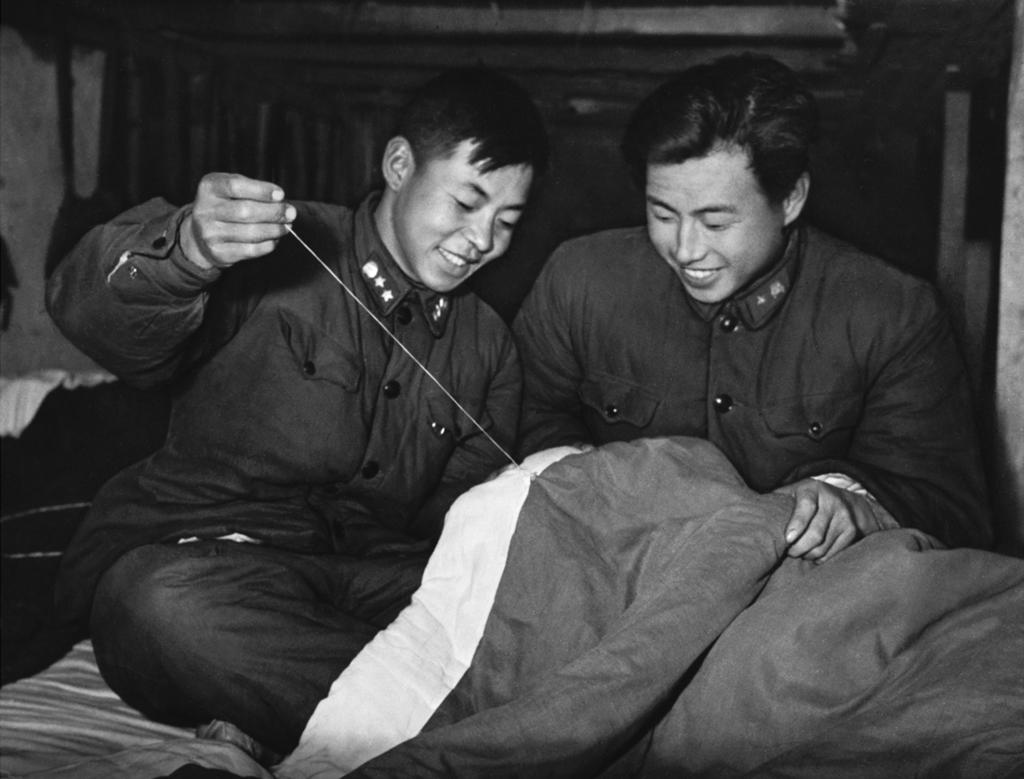 ↑雷鋒(左)在幫助戰(zhàn)友縫被子。