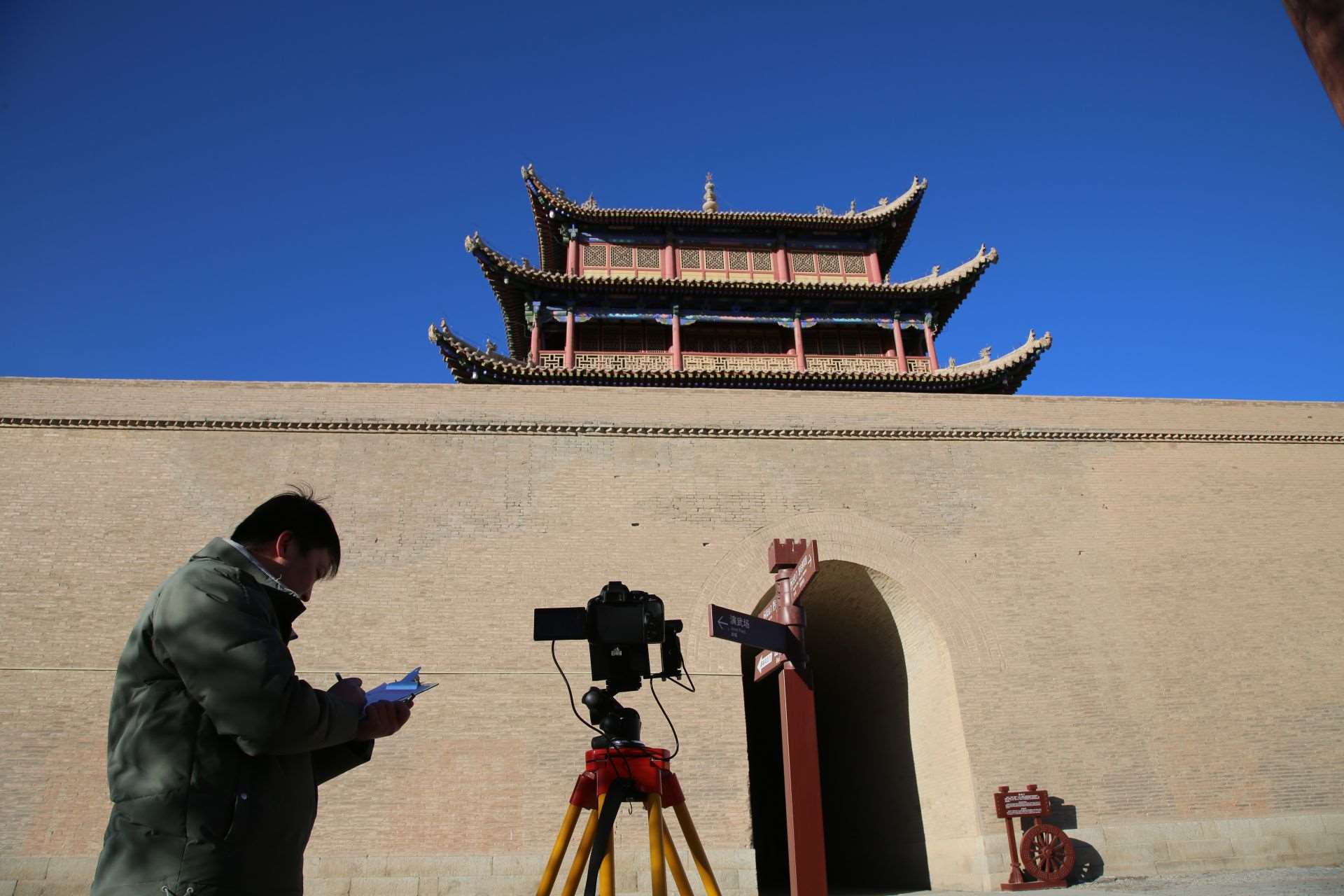 1月29日,嘉峪關(guān)絲路(長城)文化研究院文化遺產(chǎn)監(jiān)測中心工作人員高商,正在對柔遠樓城臺裂縫進行定期監(jiān)測。嘉峪關(guān)絲路(長城)文化研究院供圖