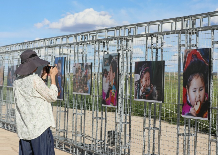 7月28日,第14屆《食色世界》攝影大展,在四子王旗格根塔拉草原旅游中心開(kāi)展。圖為游客正在拍攝攝影作品。