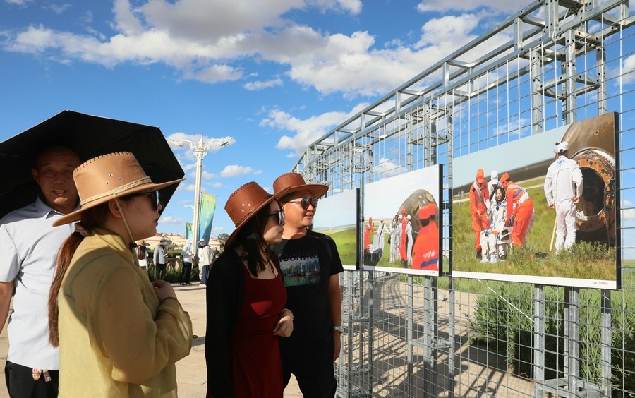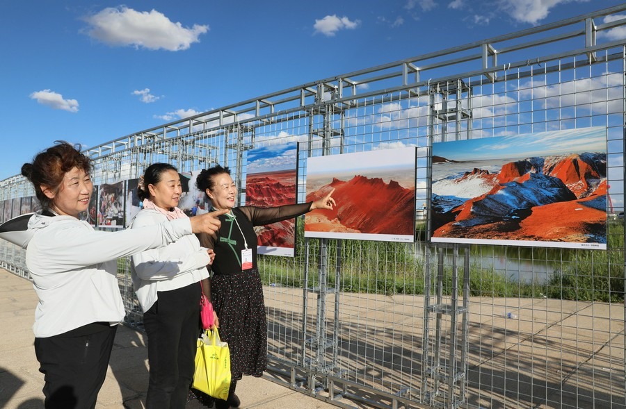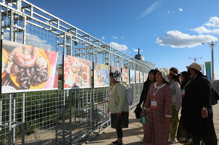 7月28日,第14屆《食色世界》攝影大展,在四子王旗格根塔拉草原旅游中心開(kāi)展。圖為游客正在參觀攝影展。
