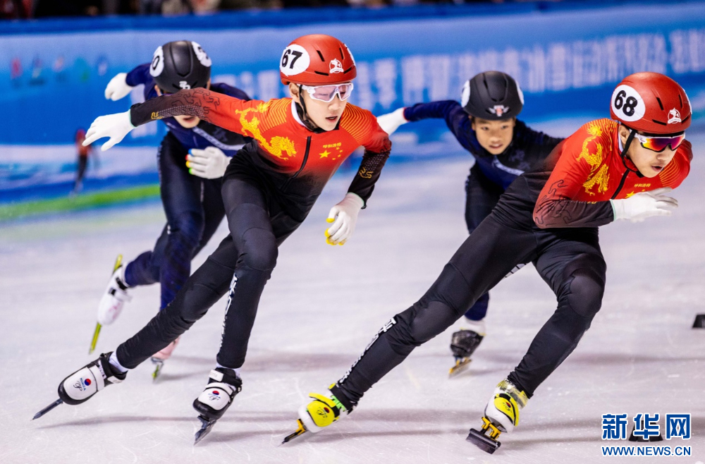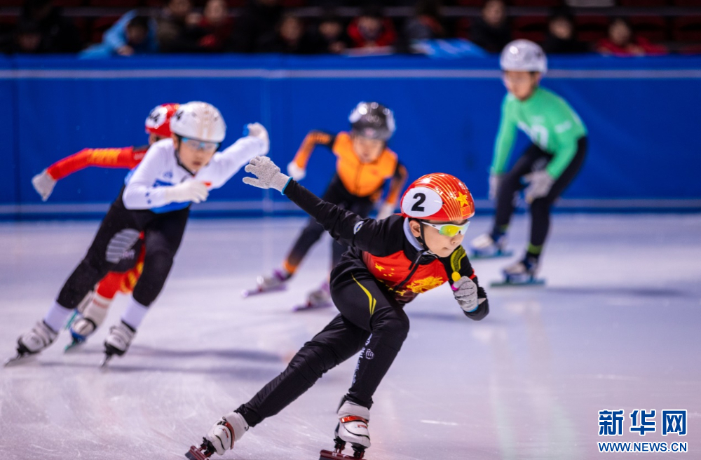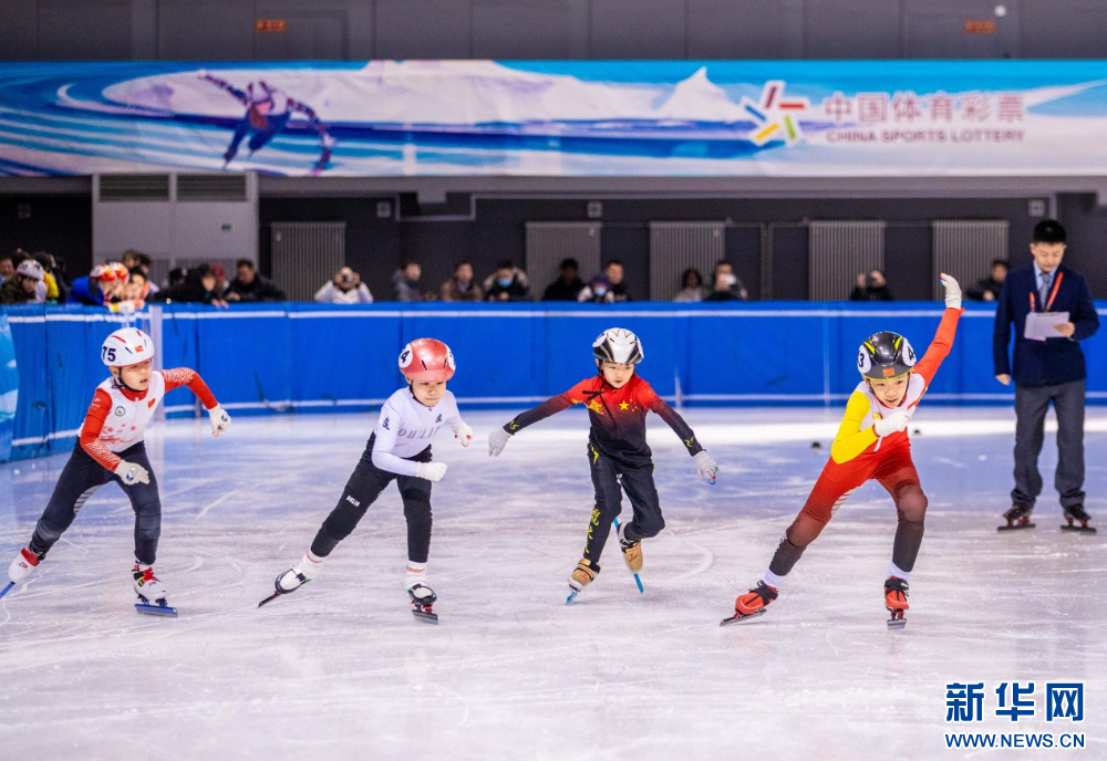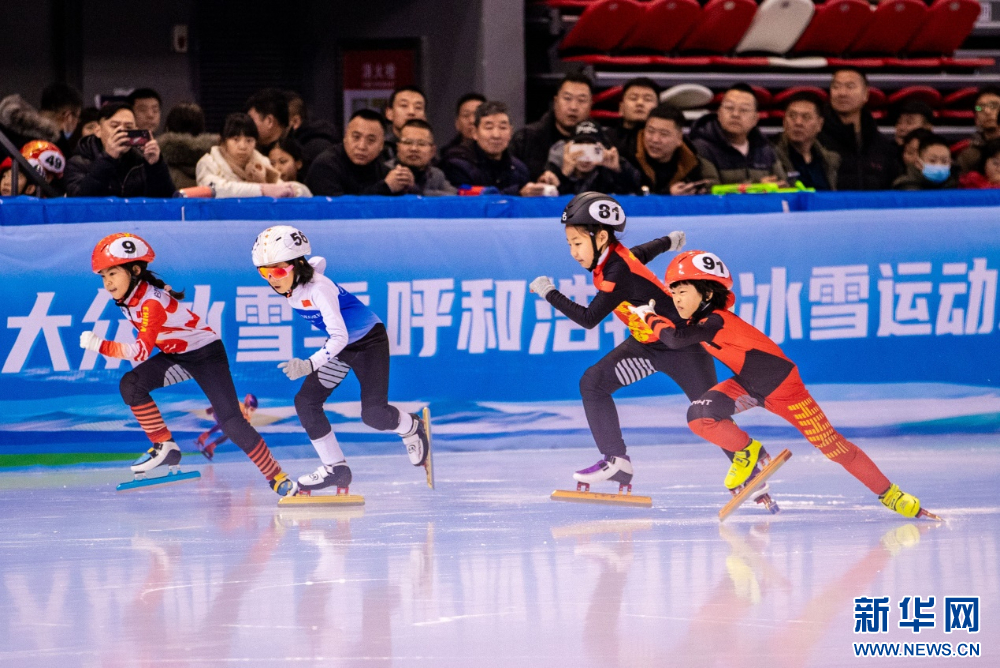 ??12月15日,參賽小選手在呼和浩特市冰雪運(yùn)動系列活動短道速滑公開賽男子甲組500米比賽中。新華網(wǎng)發(fā)(丁根厚 攝)