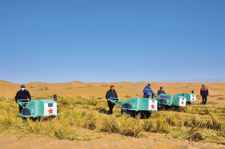 治沙人員正在用機(jī)器打草方格。記者 潘佳慧 攝