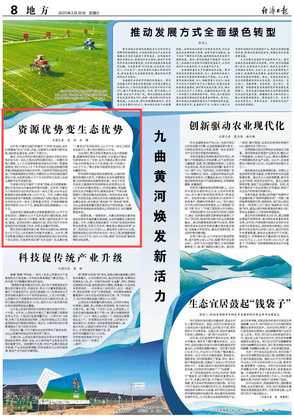 2025年2月26日,《經(jīng)濟(jì)日?qǐng)?bào)》第8版刊發(fā)題為《資源優(yōu)勢(shì)變生態(tài)優(yōu)勢(shì)》的文章,報(bào)道了近年來(lái),內(nèi)蒙古全面打好黃河“幾字彎”攻堅(jiān)戰(zhàn),如今沙漠瀚海“風(fēng)光”無(wú)限,風(fēng)能、光能轉(zhuǎn)化為源源不斷的電能,輸送到全國(guó)各地,點(diǎn)亮了萬(wàn)家燈火。