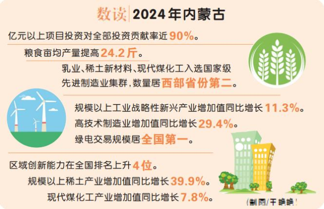 新賽道上,內(nèi)蒙古新能源項(xiàng)目裝機(jī)首破1億千瓦并居全國第一,北方稀土全球規(guī)模最大的高端綠色冶煉升級改造項(xiàng)目投產(chǎn),國內(nèi)首個(gè)工業(yè)天然氣摻燒綠氫示范項(xiàng)目在內(nèi)蒙古點(diǎn)火成功,集大原高鐵開通運(yùn)行,集通鐵路電氣化改造項(xiàng)目完工,全國首臺(tái)“零碳排放”重型礦用卡車在錫盟投用,勝利至張北特高壓輸電工程投運(yùn),全區(qū)智算能力8.7萬P、居全國第一,呼包鄂三市在算力網(wǎng)絡(luò)和碳基復(fù)合材料等多個(gè)領(lǐng)域布局未來產(chǎn)業(yè)重點(diǎn)項(xiàng)目200多個(gè)、總投資超2000億元……2024年,隨著一批高質(zhì)量重大項(xiàng)目落地,全區(qū)億元以上投資施工項(xiàng)目突破3000個(gè),完成投資比上年增長16.6%,對全部投資的貢獻(xiàn)率逼近90%。