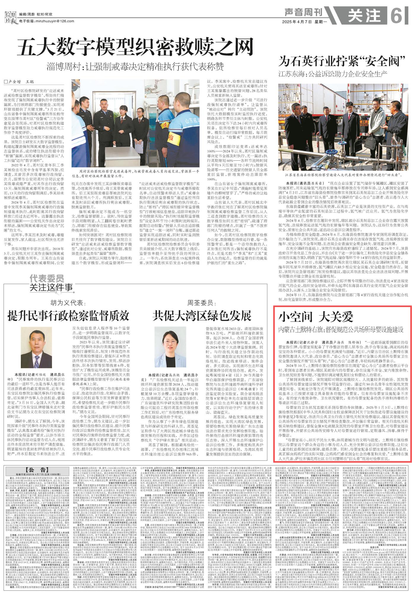 2025年4月7日,《檢察日報》第6版刊發(fā)題為《內蒙古土默特右旗:督促規(guī)范公共場所母嬰設施建設》的文章,報道了內蒙古自治區(qū)土默特右旗檢察院以母嬰室這個群眾身邊的小事為切入點,充分發(fā)揮公益訴訟檢察職能,讓婦女兒童的權益得到切實保障,讓媽媽們感受到全社會的尊重和關愛。