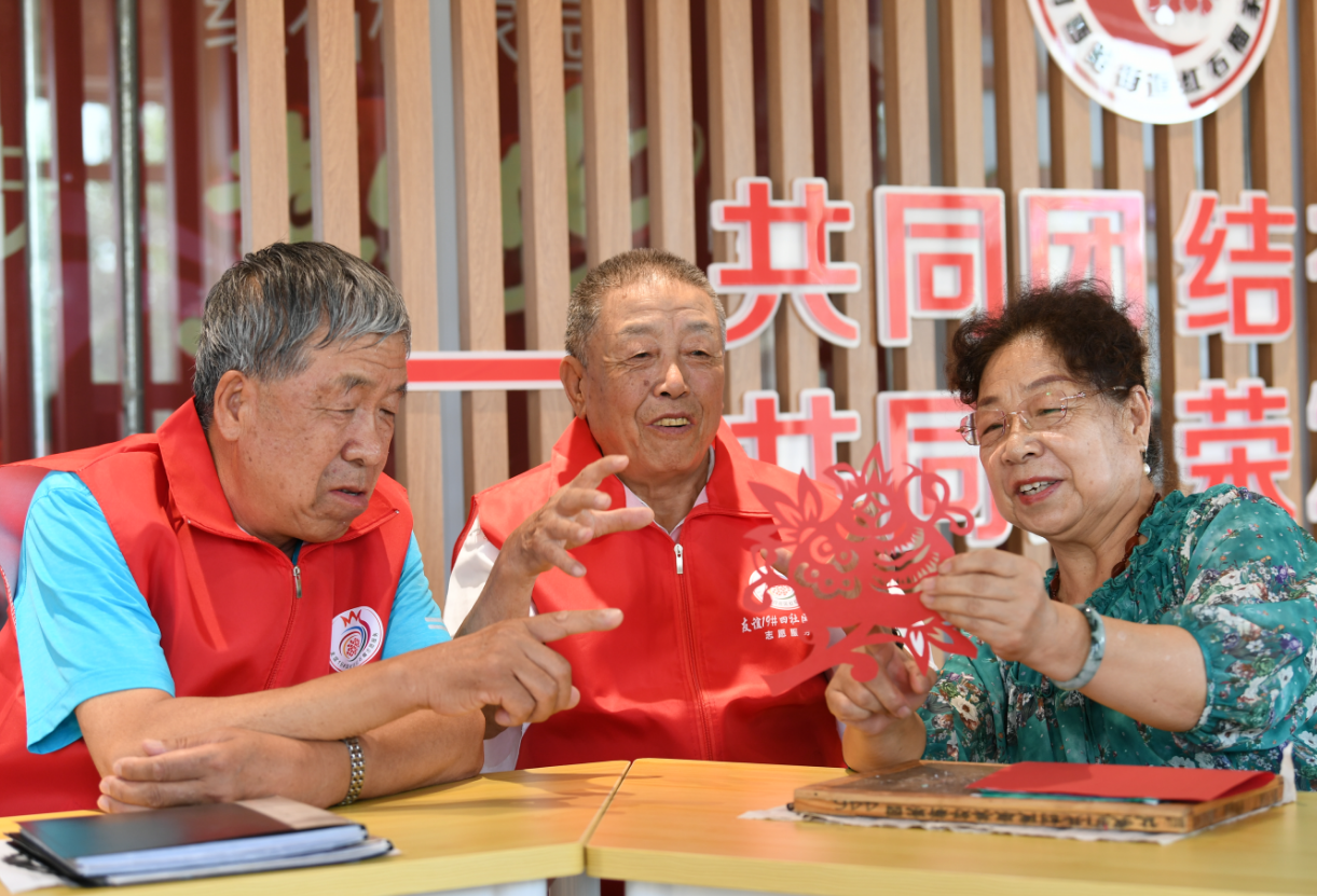 包頭市昆都侖區(qū)友誼19小區(qū)社區(qū)黨群服務(wù)中心紅石榴宣講團(tuán)成員與社區(qū)居民一起剪紙。