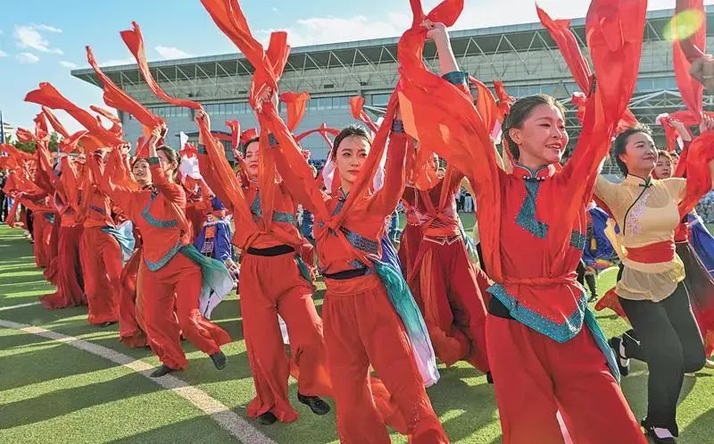內(nèi)蒙古師范大學(xué)的學(xué)生共同表演舞蹈節(jié)目。