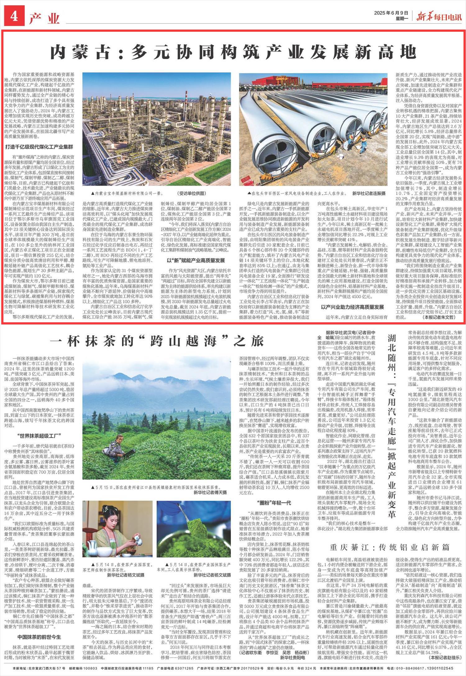 2025年6月9日《新華每日電訊》第4版刊發(fā)了《內(nèi)蒙古:多元協(xié)同構(gòu)筑產(chǎn)業(yè)發(fā)展新高地》的文章,報(bào)道了內(nèi)蒙古依托深厚的煤炭資源大力發(fā)展現(xiàn)代煤化工產(chǎn)業(yè),構(gòu)建起千億級(jí)的產(chǎn)業(yè)集群。憑借資源優(yōu)勢(shì)和精準(zhǔn)的產(chǎn)業(yè)發(fā)展戰(zhàn)略,內(nèi)蒙古正加速構(gòu)建多元協(xié)同的產(chǎn)業(yè)發(fā)展體系,在祖國(guó)北疆書寫產(chǎn)業(yè)高質(zhì)量發(fā)展新畫卷。