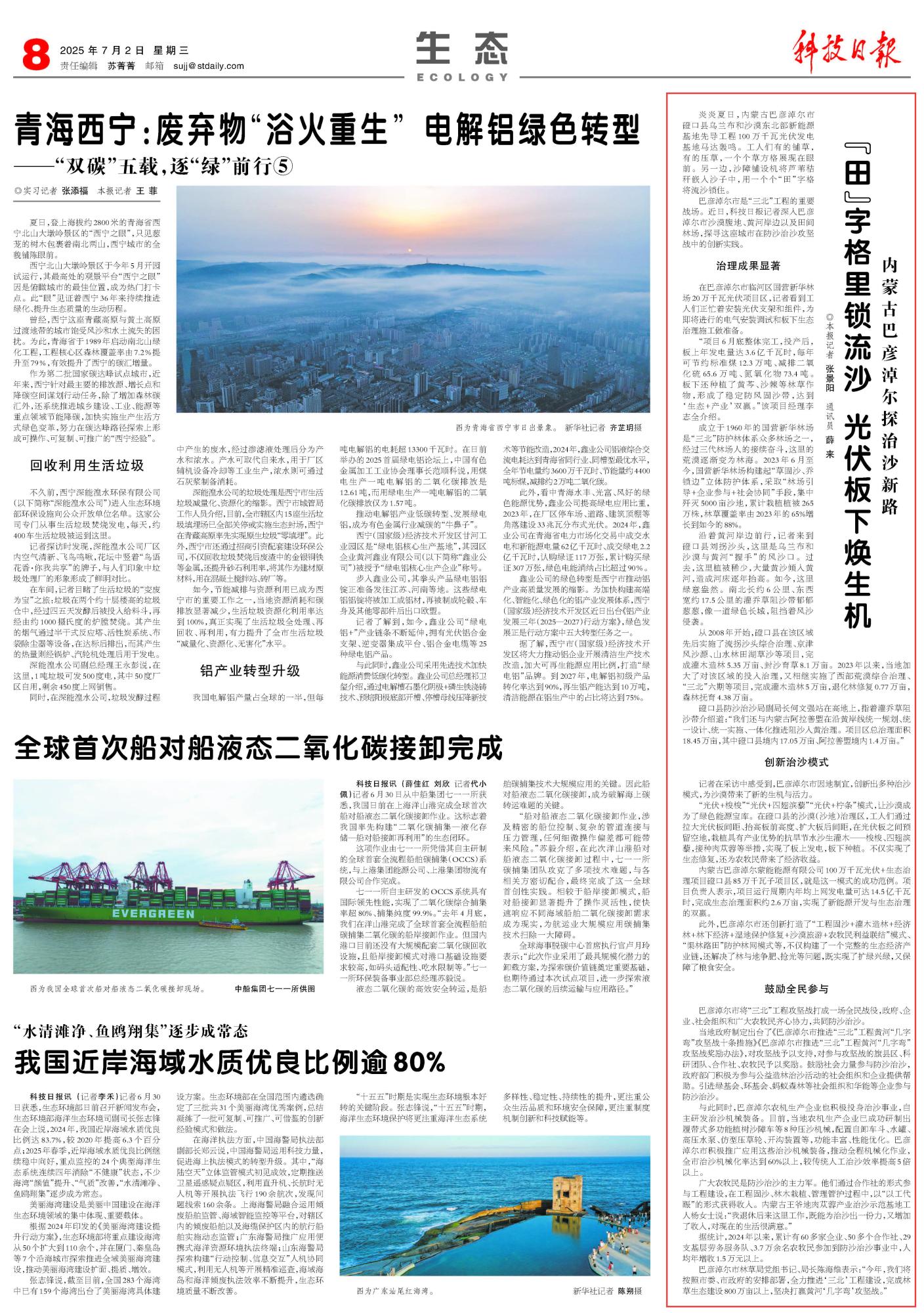 2025年7月2日《科技日?qǐng)?bào)》第8版刊發(fā)了《內(nèi)蒙古巴彥淖爾探治沙新路“田”字格里鎖流沙 光伏板下煥生機(jī)》的文章,報(bào)道了內(nèi)蒙古巴彥淖爾市將“三北”工程攻堅(jiān)戰(zhàn)打成一場(chǎng)全民戰(zhàn)役,政府、企業(yè)、社會(huì)組織和廣大農(nóng)牧民齊心協(xié)力,共同防沙治沙。因地制宜,創(chuàng)新出多種治沙模式,為沙漠帶來(lái)了新的生機(jī)與活力。