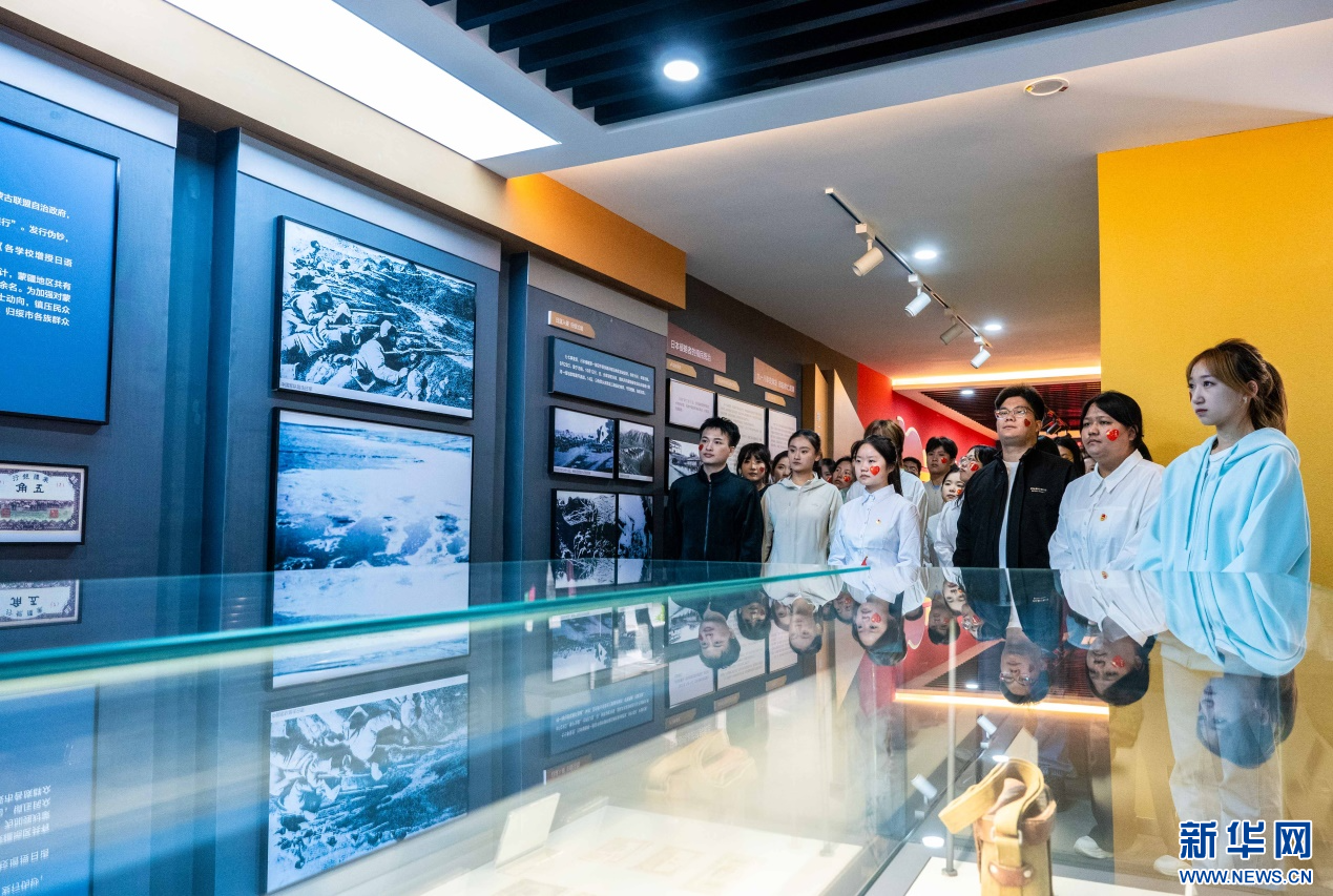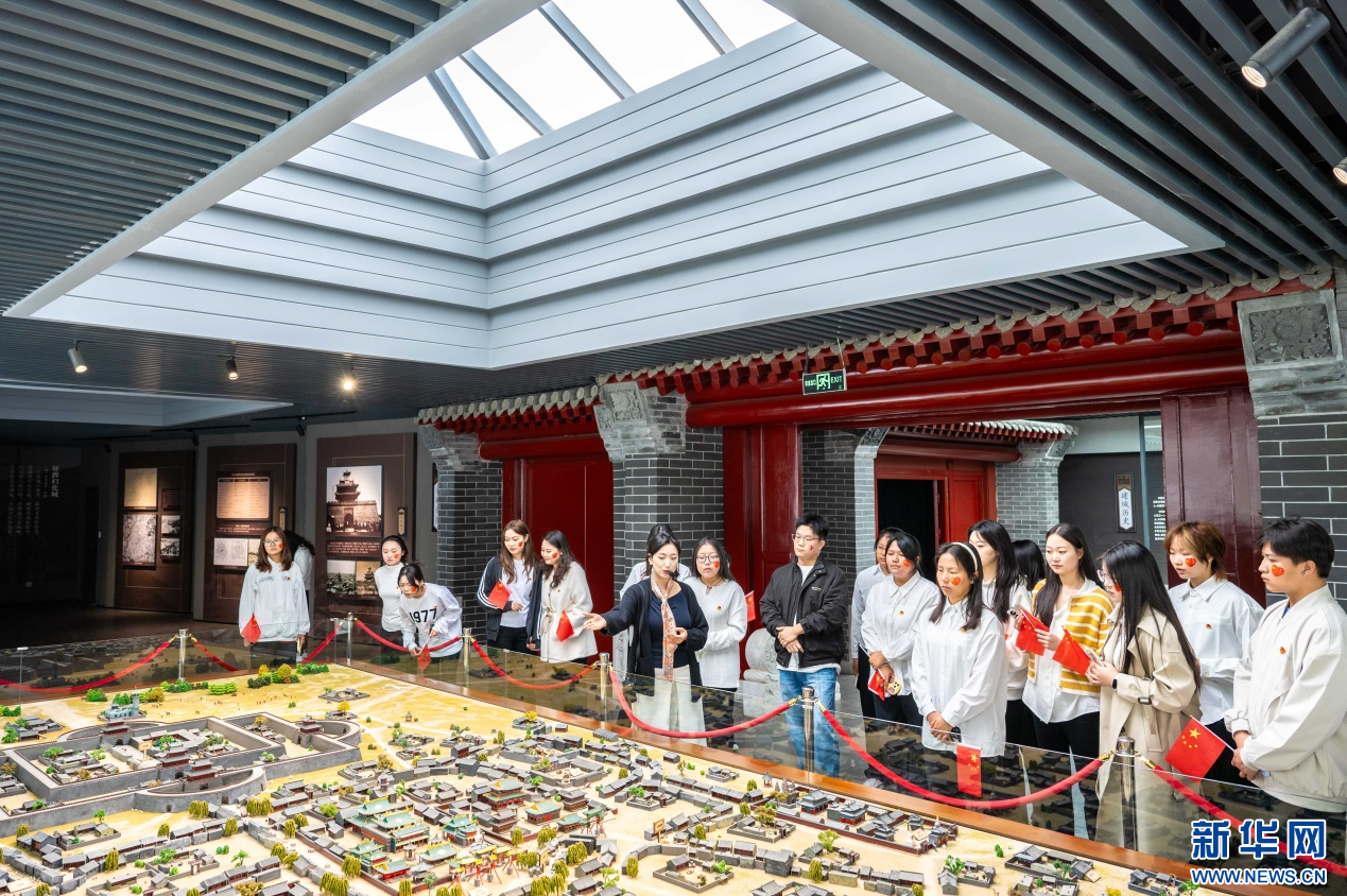 ??10月1日,內(nèi)蒙古師范大學(xué)馬克思主義學(xué)院的學(xué)子們?cè)跉w化城展示館參觀研學(xué)。新華網(wǎng)發(fā)(丁根厚 攝)