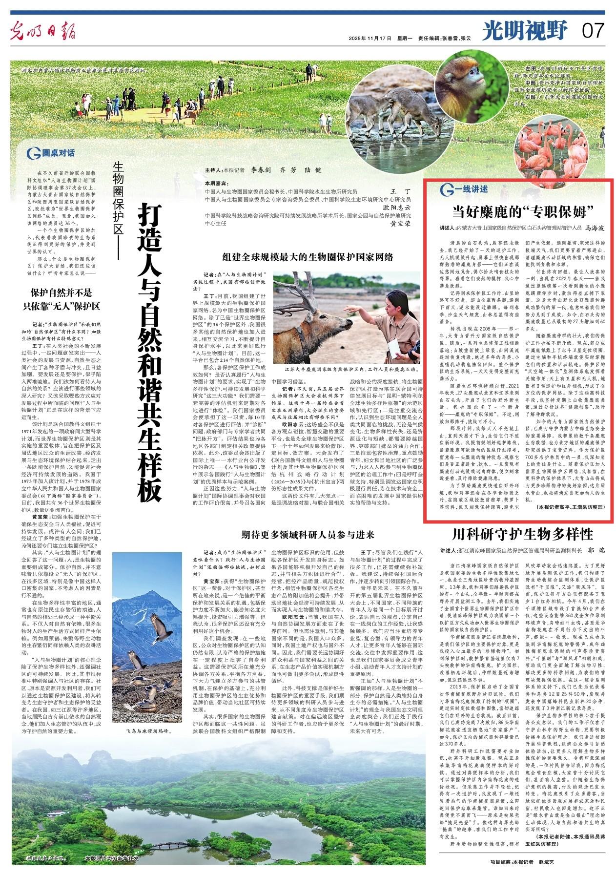 2025年11月17日,《光明日報》第7版刊發(fā)題為《當(dāng)好麋鹿的“專職保姆”》的文章,以內(nèi)蒙古大青山國家級自然保護(hù)區(qū)白石頭溝管理站管護(hù)人員馬海波的視角,講述當(dāng)好麋鹿的“專職保姆”的故事,如今白石頭溝的麋鹿數(shù)量已從最初的27頭增加到60多頭。