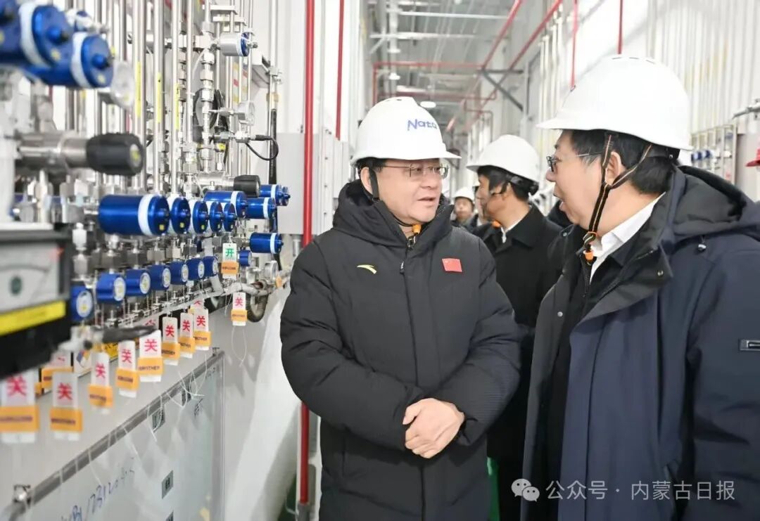 12月2日,自治區(qū)黨委書(shū)記王偉中在南大光電(烏蘭察布)有限公司察看高純電子級(jí)三氟化氮生產(chǎn)情況。草原云·內(nèi)蒙古新聞網(wǎng)記者 馬建兵 攝