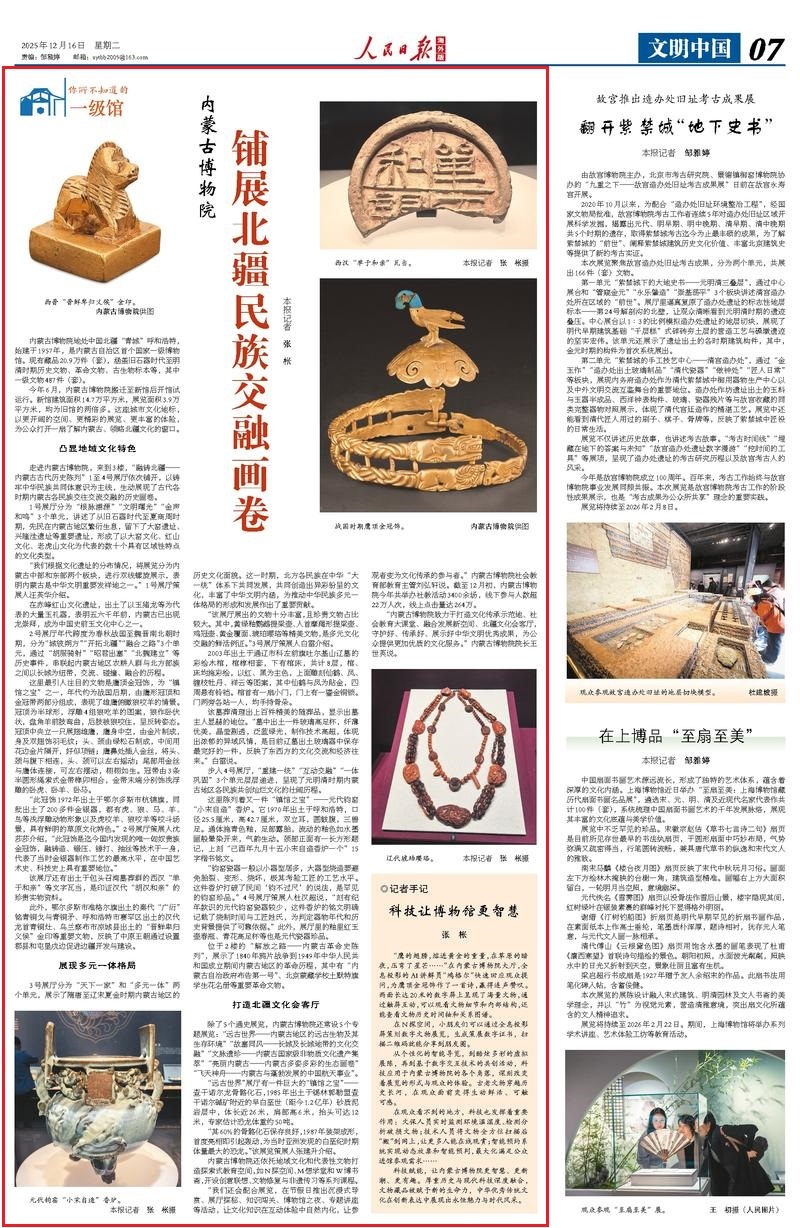 12月16日,《人民日報(bào)海外版》刊發(fā)《內(nèi)蒙古博物院 鋪展北疆民族交融畫卷》,報(bào)道內(nèi)蒙古自治區(qū)首個(gè)國家一級(jí)博物館今年6月搬遷至新館后開館試運(yùn)行。新館建筑面積14.7萬平方米,展覽面積3.9萬平方米,均為舊館的兩倍多。這座城市文化地標(biāo),以更開闊的空間、更精彩的展覽、更豐富的體驗(yàn),為公眾打開一扇了解內(nèi)蒙古、領(lǐng)略北疆文化的窗口。