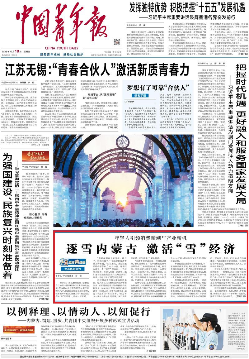 2025年12月18日《中國青年報》第1版刊發(fā)了《大市場新活力 年輕人引領(lǐng)消費(fèi)新潮與產(chǎn)業(yè)新機(jī) 逐雪內(nèi)蒙古 激活“雪”經(jīng)濟(jì)》的文章,報道了烏蘭察布大河灣滑雪場是打造“冰雪+”復(fù)合體驗的縮影——將滑雪、火山、民俗與草原深度綁定,串聯(lián)成一條完整的冬季體驗鏈。