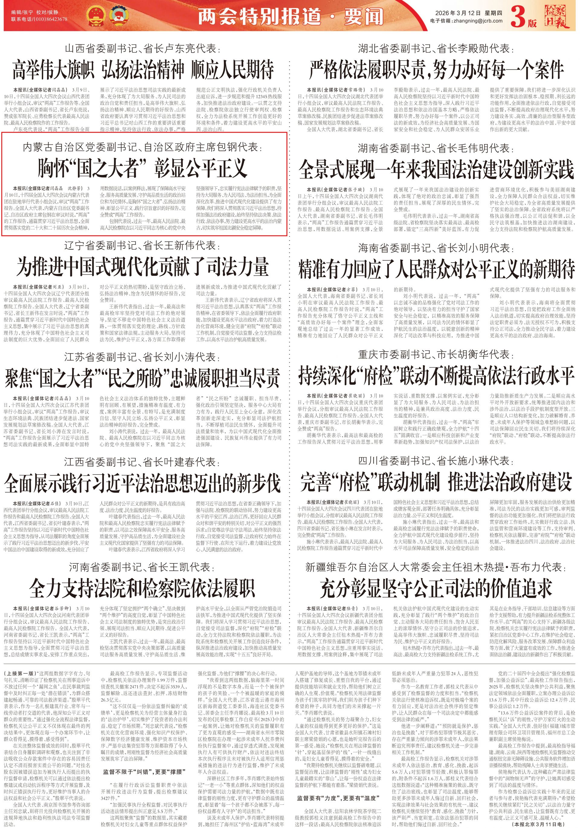 2026年3月11日《檢察日?qǐng)?bào)》第3版刊發(fā)了《內(nèi)蒙古自治區(qū)黨委副書(shū)記、自治區(qū)政府主席包鋼代表: 胸懷“國(guó)之大者” 彰顯公平正義 》的文章,報(bào)道了十四屆全國(guó)人大四次會(huì)議內(nèi)蒙古代表團(tuán)在駐地舉行代表小組會(huì)議,審議“兩高”工作報(bào)告。全國(guó)人大代表,內(nèi)蒙古自治區(qū)黨委副書(shū)記、自治區(qū)政府主席包鋼在審議時(shí)說(shuō),“兩高”的工作報(bào)告,通篇貫穿習(xí)近平法治思想,全面貫徹落實(shí)黨的二十大和二十屆歷次全會(huì)精神,用數(shù)據(jù)說(shuō)話,以案例釋法,展現(xiàn)了保障高水平安全、服務(wù)高質(zhì)量發(fā)展、守護(hù)高品質(zhì)生活的政治站位和為民情懷,是胸懷“國(guó)之大者”、弘揚(yáng)法治精神、彰顯公平正義、踐行宗旨意識(shí)的好報(bào)告,完全贊成“兩高”工作報(bào)告。