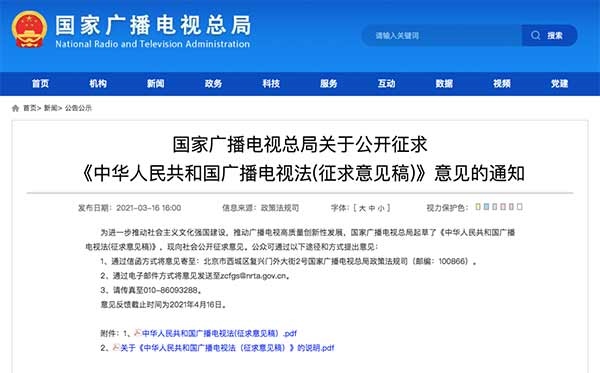 3月16日,國家廣播電視總局發(fā)布《中華人民共和國廣播電視法(征求意見稿)》(以下簡稱“征求意見稿”),向社會公開征求意見。征求意見稿分為總則、業(yè)務準入、制作播放、傳輸覆蓋、公共服務、扶持促進、安全保障、監(jiān)督管理、法律責任和附則,共10章80條。意見反饋截止日期為2021年4月16日。