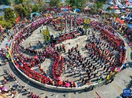 3月2日,當(dāng)?shù)厝罕娕c來自各地的游客踩著相同的鼓點(diǎn)進(jìn)場舞蹈(無人機(jī)照片)。