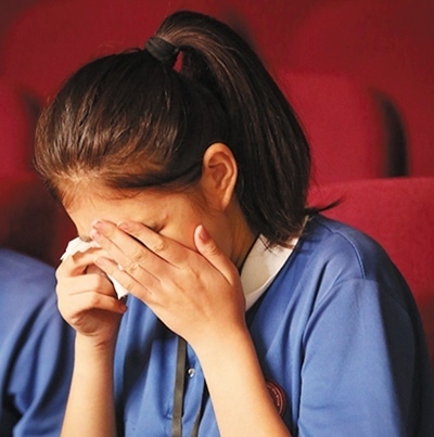 除了制作,放映活動(dòng)現(xiàn)場引導(dǎo)同樣重要。視障朋友在哪里下車最方便?一路上有多少個(gè)障礙物?從電梯出來到影廳一共有多少米?每隔幾米需要志愿者維持秩序?每次放映活動(dòng)前,同學(xué)們都會(huì)制定周密的工作流程,提前把活動(dòng)路線完整地走上好幾遍。他們知道,每一個(gè)細(xì)節(jié)都關(guān)乎視障朋友的體驗(yàn)。有一次,在北京朝陽劇場放映《紅海行動(dòng)》。為確保視障朋友的安全,上百名“光明影院”志愿者形成100多米長的“人形安全通道”,把他們從下車處引導(dǎo)進(jìn)電影院,直至落座。