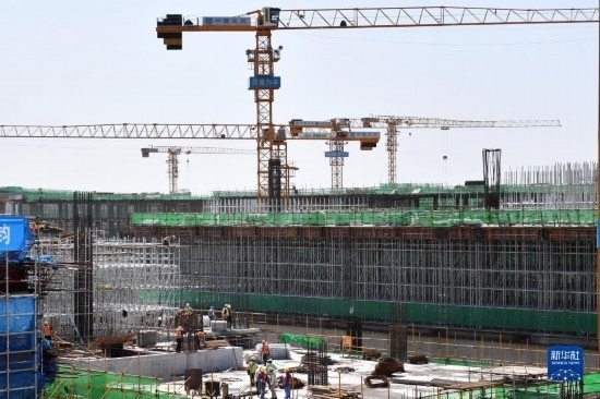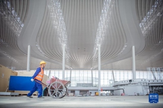 5月1日,中建八局的施工人員在長沙機場改擴建工程T3航站樓工程項目現(xiàn)場作業(yè)。