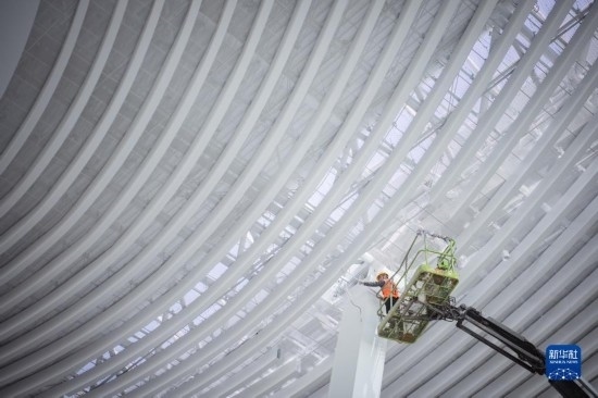 5月1日,在中建三局承建的武漢天河機場T2航站樓改造工程項目工地,工人在檢查吊頂內(nèi)管線。
