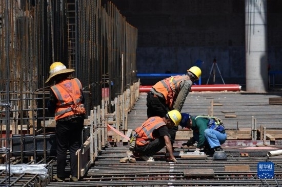 5月1日,在浙江省杭州市臨平區(qū)一個項目工地,中建三局的建設(shè)者在施工中。