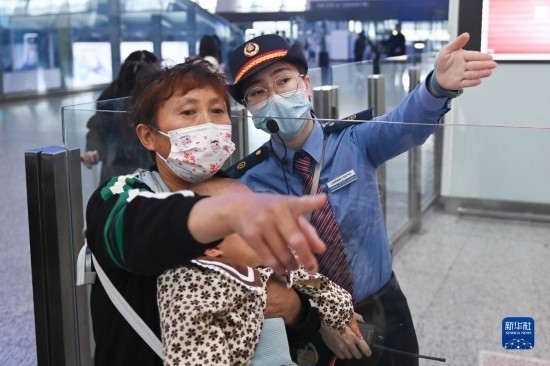5月1日,在杭州東站候車大廳,客運員陳思悅引導(dǎo)旅客前往檢票口。
