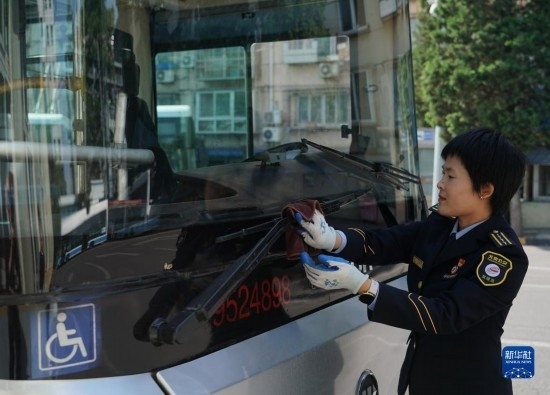 5月1日,在位于北京市朝陽區(qū)的柳芳公交場站,104路公交車駕駛員高國然在發(fā)車前進(jìn)行出車?yán)龣z。