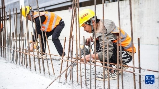 5月1日,工人在中建二局陜西分公司高鐵新城項目工地施工。