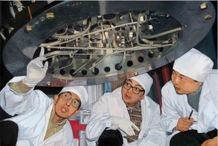 布面油畫《知難而進(jìn) 眾志成城》原型為新華社記者王呈選拍攝的一幅新聞?wù)掌?,畫面?0世紀(jì)80年代末清華大學(xué)核能與新能源技術(shù)研究院王大中、馬昌文、董鐸正在進(jìn)行5兆瓦低溫核反應(yīng)堆調(diào)試的場景。作品生動(dòng)地刻畫了以國家最高科學(xué)技術(shù)獎(jiǎng)獲得者王大中院士等為代表的清華教師勇于承擔(dān)國家重大科技項(xiàng)目,知難而進(jìn)、眾志成城的寶貴精神。