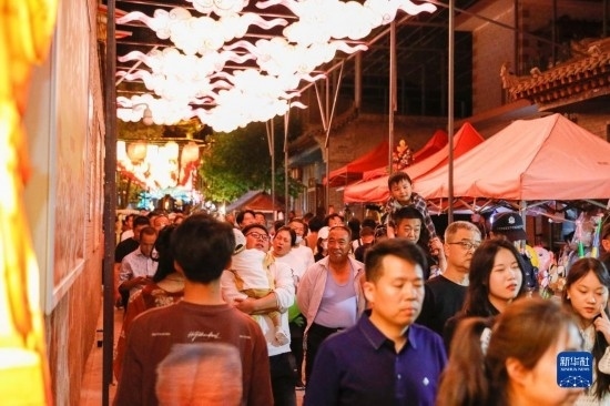 5月19日,游客在河口古鎮(zhèn)“黃河燈展”上參觀游覽。