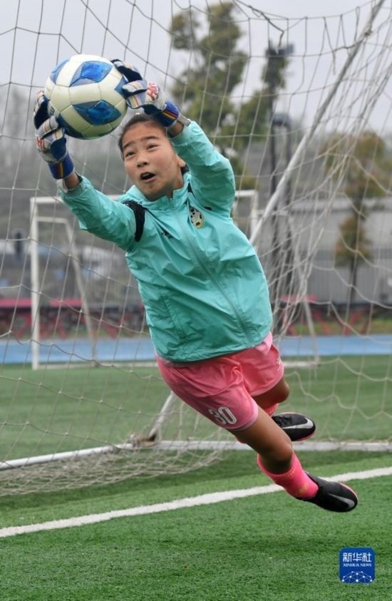 在瀘州天立春雨學(xué)校足球場,來自涼山彝族自治州的拉普么拉扎在進(jìn)行守門員訓(xùn)練(3月29日攝)。