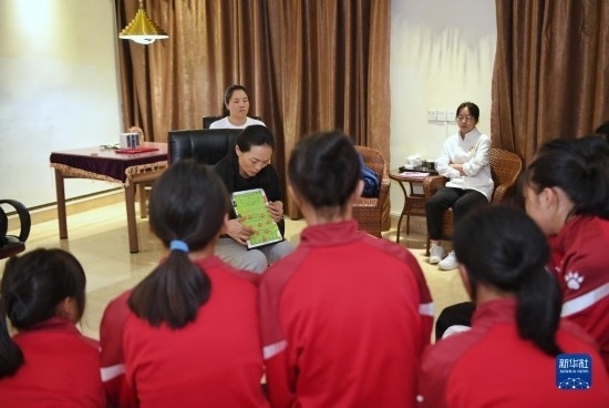 在海南瓊中縣舉辦的中國足協(xié)女足青訓(xùn)中心“希望杯”U12組比賽的空閑時段,來自涼山彝族自治州的四川隊(duì)隊(duì)員舍布么扯鳩莫(左二)和隊(duì)友們在老師帶領(lǐng)下學(xué)習(xí)文化課(4月10日攝)。