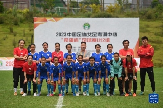 在海南瓊中縣舉辦的中國足協(xié)女足青訓(xùn)中心“希望杯”U12組四川隊(duì)對陣廣東隊(duì)的比賽后,四川隊(duì)成員在球場合影(4月10日攝)。