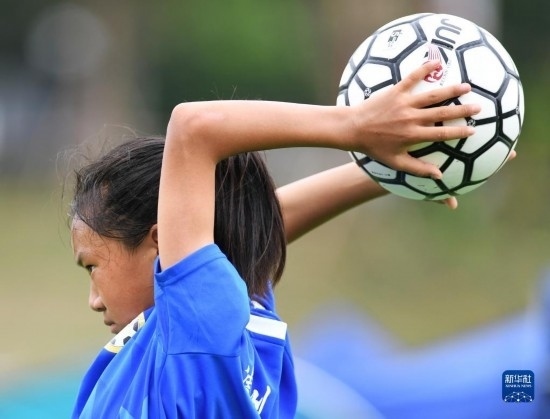 在海南瓊中縣舉辦的中國足協(xié)女足青訓(xùn)中心“希望杯”U12組四川隊(duì)對陣廣東隊(duì)的比賽中,來自涼山彝族自治州的四川隊(duì)球員舍布么扯鳩莫發(fā)邊線球(4月10日攝)。