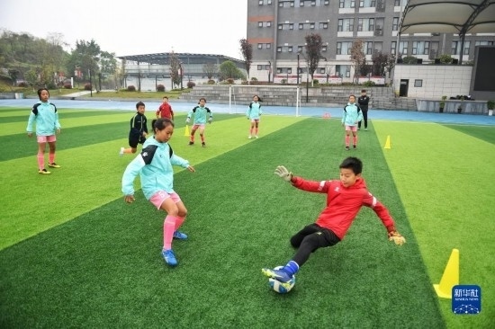 在瀘州天立春雨學(xué)校足球場,來自涼山彝族自治州的舍布么扯鳩莫(前左)與男隊(duì)一起訓(xùn)練(3月29日攝)。