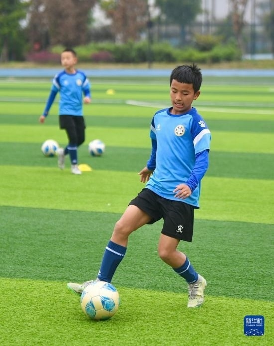 在瀘州天立春雨學(xué)校足球場,來自涼山彝族自治州的楊坤在進(jìn)行訓(xùn)練(3月29日攝)。