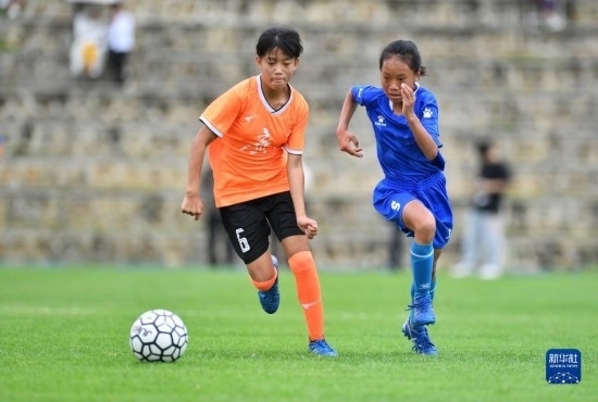 在海南瓊中縣舉辦的中國足協(xié)女足青訓(xùn)中心“希望杯”U12組四川隊(duì)對陣廣東隊(duì)的比賽中,來自涼山彝族自治州的四川隊(duì)球員舍布么扯鳩莫(右)奮力拼搶(4月10日攝)。