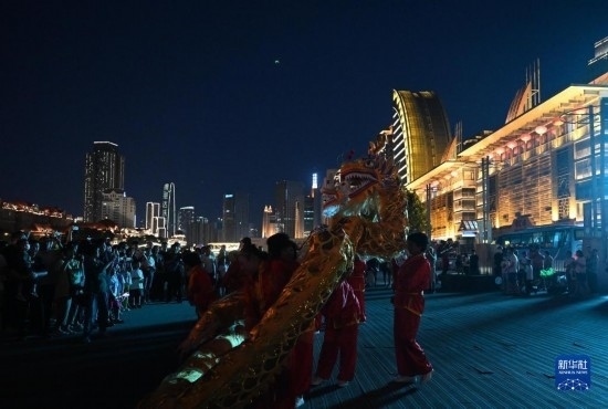 6月22日,人們?cè)谔旖蚝:庸盼幕执a頭附近欣賞舞龍表演。