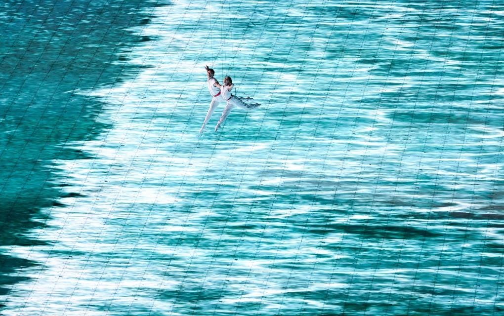 本屆亞運(yùn)會(huì)首次將3D雙威亞技術(shù)應(yīng)用于大型運(yùn)動(dòng)場中。立體飛旋于空中的男女演員與潮共舞,吊著威亞的他們在空中完成了各種高難度動(dòng)作,并與地屏中的浪潮實(shí)時(shí)互動(dòng),踏浪而行,成就了科技與藝術(shù)完美融合。