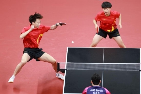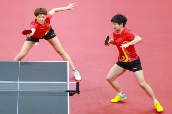 9月29日, 孫穎莎(右)/王曼昱在比賽中。新華社記者 劉續(xù) 攝