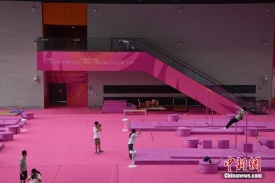 7月14日,成都東安湖體育公園內(nèi),成都大運會體操比賽訓(xùn)練場的粉色布置吸引媒體記者探訪。海綿墊、平衡木、吊環(huán)、鞍馬等設(shè)施均為粉色,充滿青春活力,令人倍感放松。目之所及,海綿墊、平衡木、吊環(huán)、鞍馬等設(shè)施均為粉色。