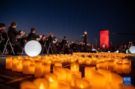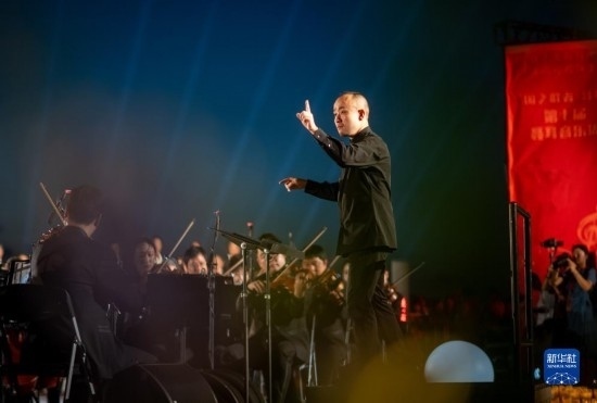 來自昆明聶耳交響樂團(tuán)及昆明市民族歌舞劇院民樂團(tuán)的演奏家們在昆明市滇池畔共同演奏包括《義勇軍進(jìn)行曲》《賣報(bào)歌》在內(nèi)的聶耳代表作(7月17日攝)。
