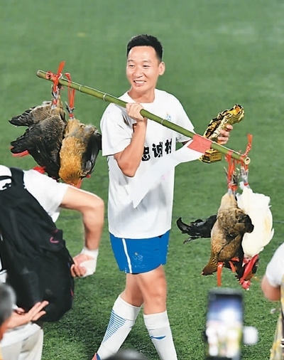 參賽球員展示“村超”最佳射手獎品——榕江小香雞。