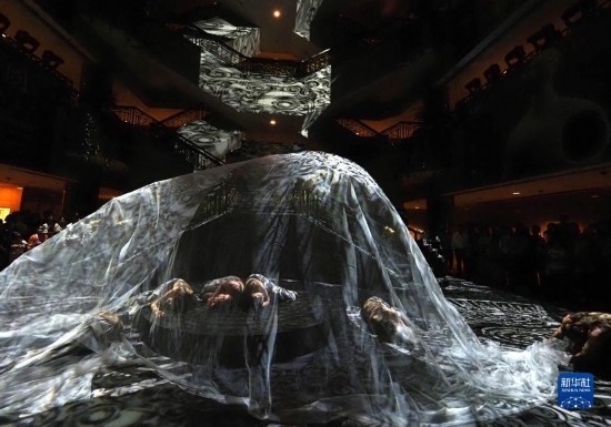 當(dāng)日,上海博物館攜手杭州良渚遺址管理區(qū)管理委員會推出“研色·良渚之夜”沉浸式綜合藝術(shù)秀演出。作為“何以中國”系列大展的第二展“實證中國:崧澤·良渚文明考古特展”的活動之一,“研色·良渚之夜”采用現(xiàn)代舞、服裝秀、音樂秀和數(shù)字投影燈光秀等多種舞臺藝術(shù)形式,結(jié)合良渚核心色彩和文化元素,讓觀眾沉浸式體驗良渚穿越五千年的美學(xué)文化。新華社記者 任瓏 攝