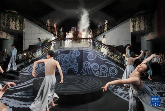 8月25日晚,演員在上博“研色·良渚之夜”綜合藝術(shù)秀上表演現(xiàn)代舞。新華社記者 任瓏 攝