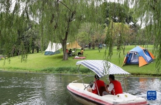 10月4日,在上海閔行體育公園,游船從岸邊露營地旁劃過。