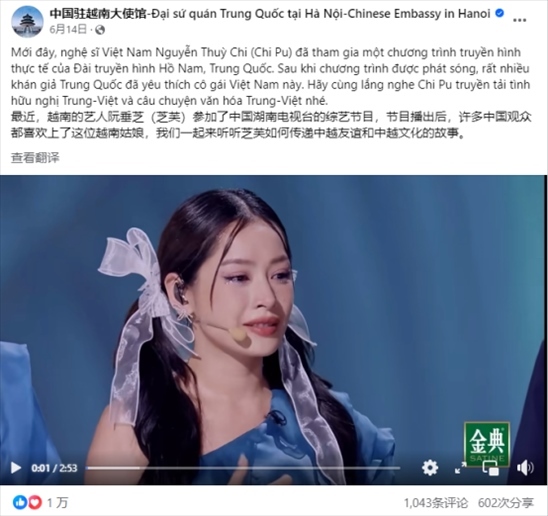 中國駐越南大使館Facebook發(fā)文點贊越南藝人芝芙在《乘風(fēng)2023》傳播中越文化。