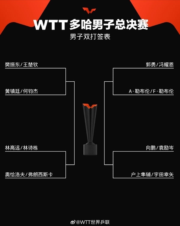 男雙選手分別是:樊振東/王楚欽、張禹珍/林仲勛、宇田幸矢/戶上隼輔、林高遠/林詩棟、艾利克斯· 勒布倫/費利克斯·勒布倫、帕特里克·弗朗西斯卡/迪米特里·奧恰洛夫、莊智淵/林昀儒、黃鎮(zhèn)廷/何鈞杰。