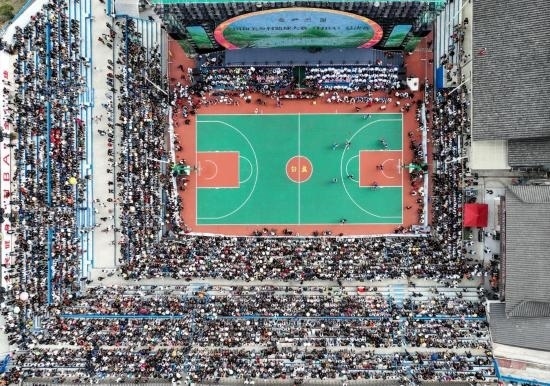 這是10月25日拍攝的全國和美鄉(xiāng)村籃球大賽(村BA)總決賽現(xiàn)場(無人機(jī)照片)。新華社記者 歐東衢 攝